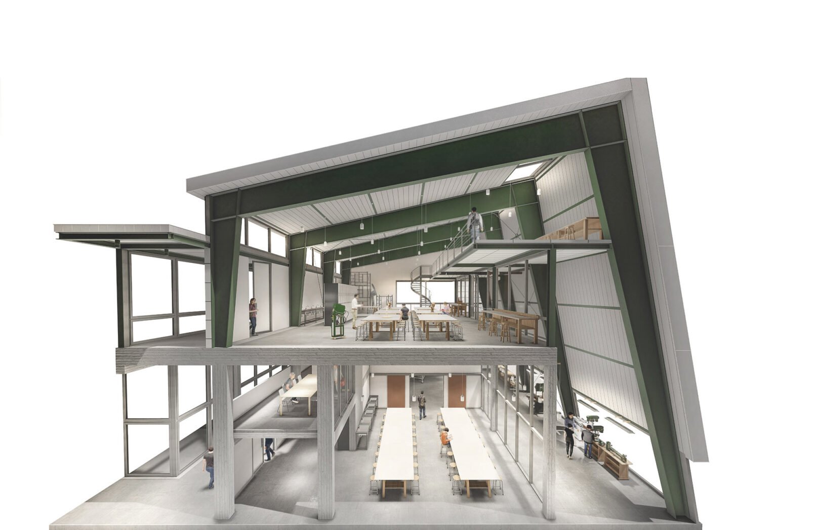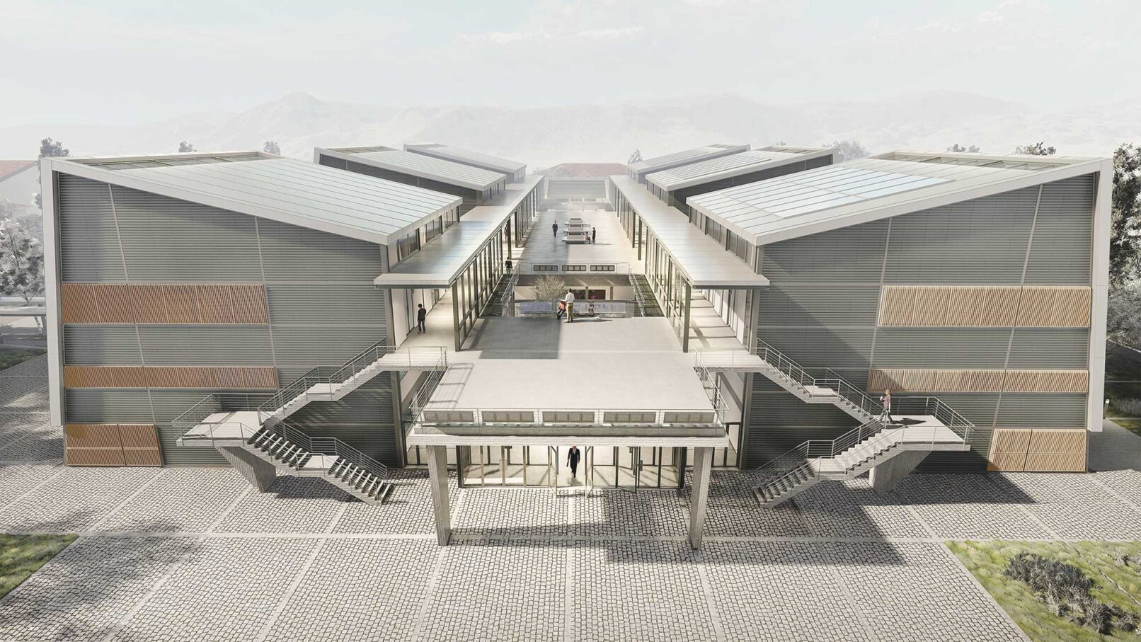 Οι επιμέρους λειτουργικές ενότητες, διαρθρώνονται με τη μορφή έξι μονάδων οι οποίες διατάσσονται με σταθερό ρυθμό κενών και πλήρων δημιουργώντας συμμετρία στη συνθετική δομή κατά τον άξονα βορρά-νότου και ανατολής – δύσης. Μορφολογικά εκφράζονται με κεκλιμένες στέγες – επιφάνειες που «αγκαλιάζουν» τον γραμμικό πυρήνα προσφέροντας τη δυνατότητα υπαίθριας εκτόνωσης.