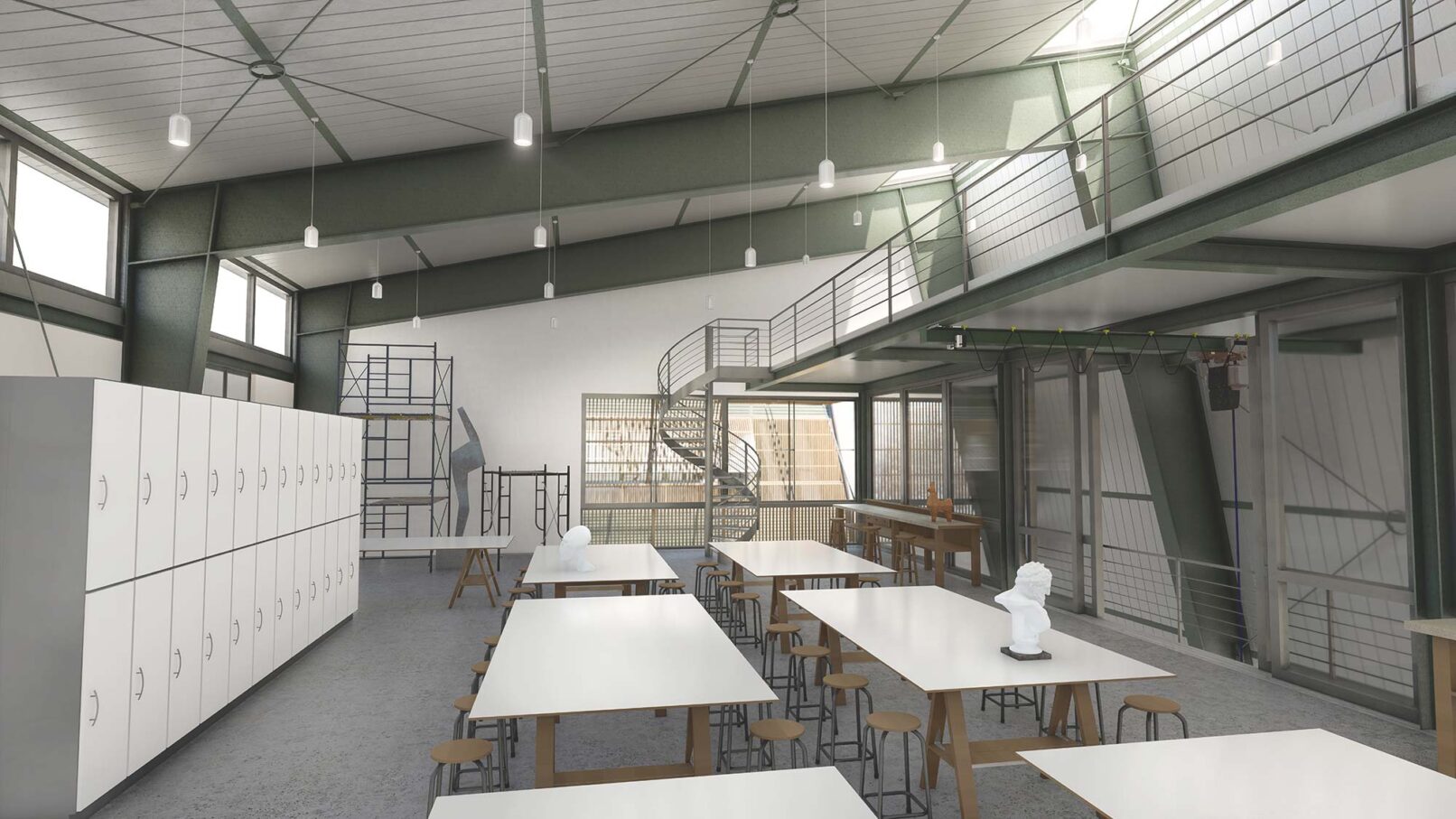 O καλλιτεχνικός και δημιουργικός της Σχολής εκφράστηκε ως ραχοκοκαλιά γύρω από την οποία δημιουργήθηκαν μεγάλοι ενιαίοι χώροι με λειτουργική ευελιξία που ενισχύει τον εργαστηριακό και πολυδύναμο χαρακτήρα μιας σύγχρονης Σχολής Καλών Τεχνών.
